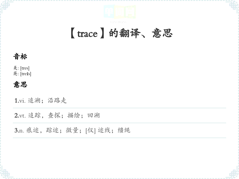- 词性:动词(to trace)和名词(a trace)。