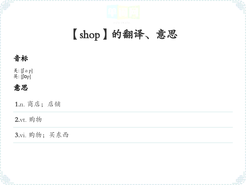 - 字面意思:Shop的字面含义是一个供人们购买商品或服务的地方,通常指零售店或商店。