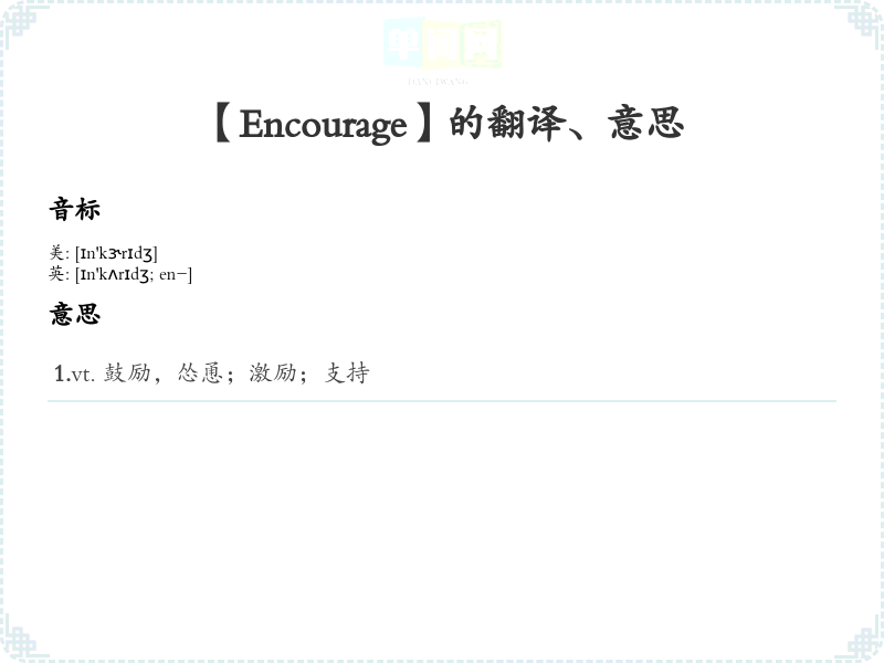 - 音标记忆法:Encourage 的音标是 /ɪnˈkɜːrɪdʒ/。可以通过反复朗读并与其意义联想,来帮助记忆。