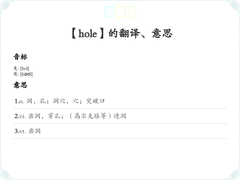 - “hole”的发音与“好”(hǎo)相似,可以想象一个“好”的洞,比如一个装满宝藏的洞,帮助记忆这个词的意义。
