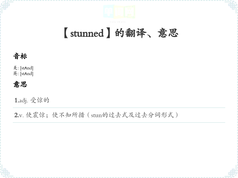 1.adj. 受惊的 2.v. 使震惊;使不知所措(stun的过去式及过去分词形式)