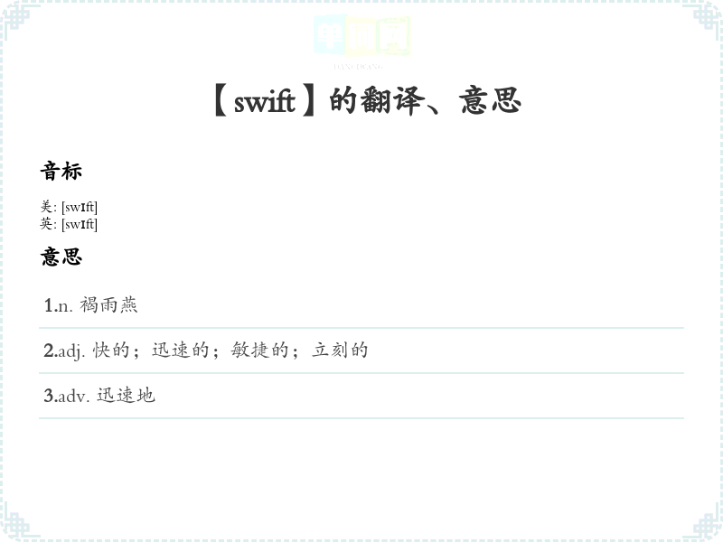 - 音标记忆法:记住 swift 的发音 /swɪft/,可以通过将其与“shift”相联系,想象快速的转变或移动。