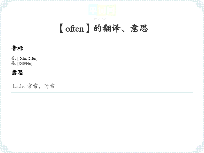 - 音标记忆法:将often的音标/ˈɔːfən/分解为音节,进行重复练*,帮助记忆其发音。