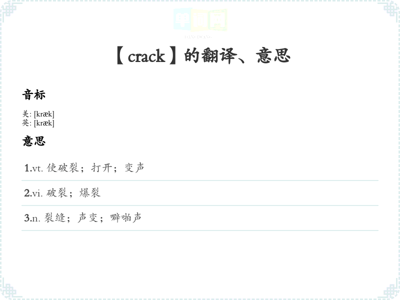 - 通过记住 "crack" 的词根,理解其与“破裂”相关的含义,可以帮助记住词义。例如,想到“crack”时,可以联想到“crack open” (打开)、“crack down” (**)等短语,这些短语都与“破裂”或“打破”有关。