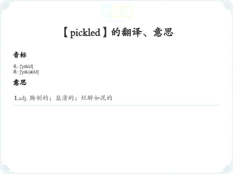 - 谐音联想记忆:联想“pickled”与“皮克尔”(pickle)的发音相似,可以想象到腌制食物的过程。