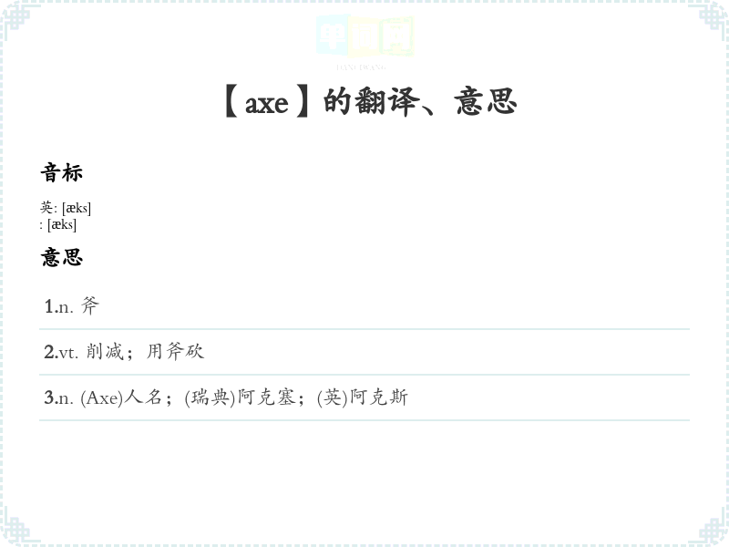 通过以上分析与学*方法,可以更好地理解和记忆单词“axe”的含义与用法。