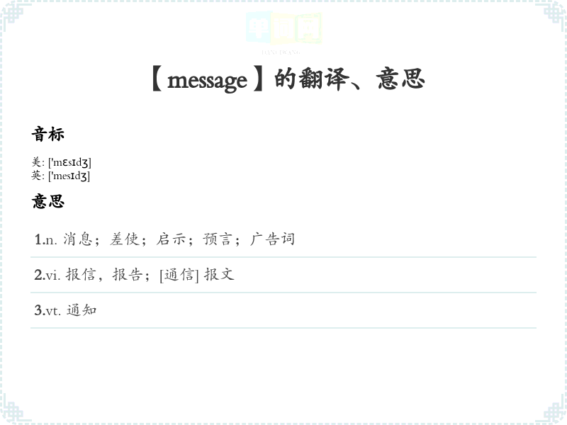 - 音标记忆法:/ˈmɛsɪdʒ/。通过分解音节记忆,强调“mes”和“sage”两个部分。