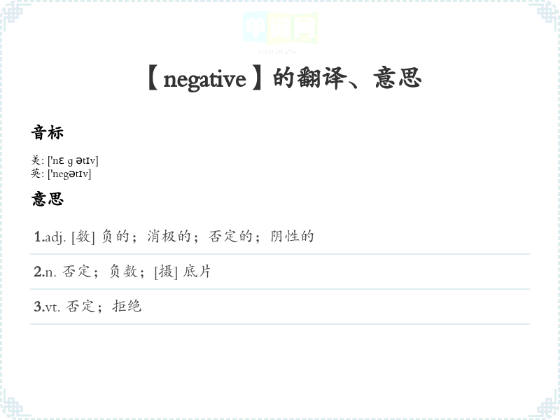 - 音标记忆法:通过学*发音 /ˈnɛɡətɪv/,可以帮助记住单词的发音和拼写。
