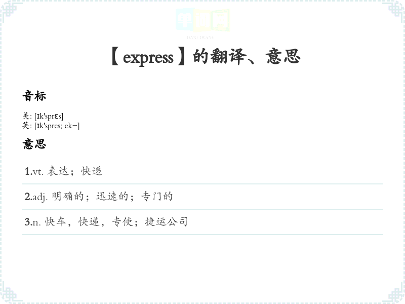 - 词性:动词(to express),名词(an express)、形容词(express delivery)。
