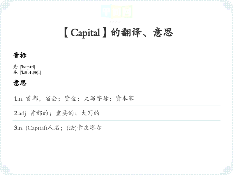 - 学*时可以先记住音标 /ˈkæpɪtl/,可以分解为“cap”和“ital”,并联想到“资本”的中文发音,使之更易记忆。