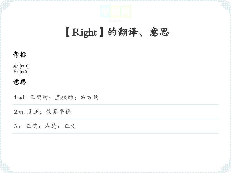 - 音标记忆法:记住“right”的音标 /raɪt/,可以尝试发音练*,通过拼读分解音节来加深记忆。