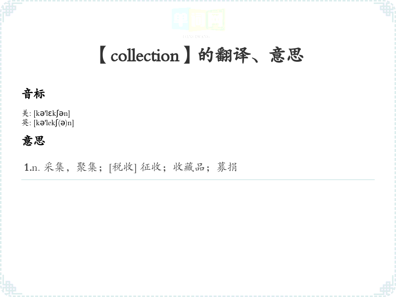 - 了解“collect”表示“收集”,“ion”表示“动作或状态”。通过词根记忆,可以联想到collection是“收集的动作或状态”的结果,有利于记忆及理解。