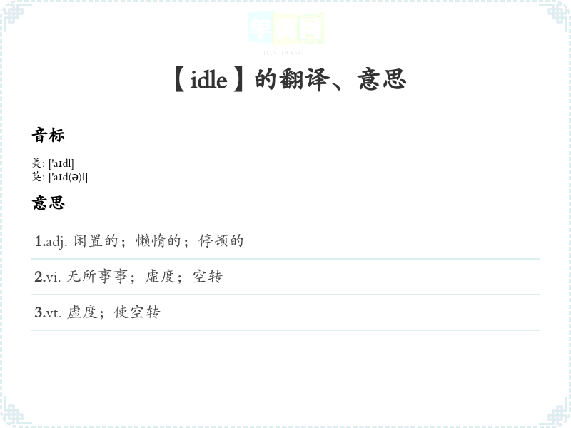词根记忆法:可以将“idle”与其他相关词根联想,如“idleness”(闲散),从而加深理解。