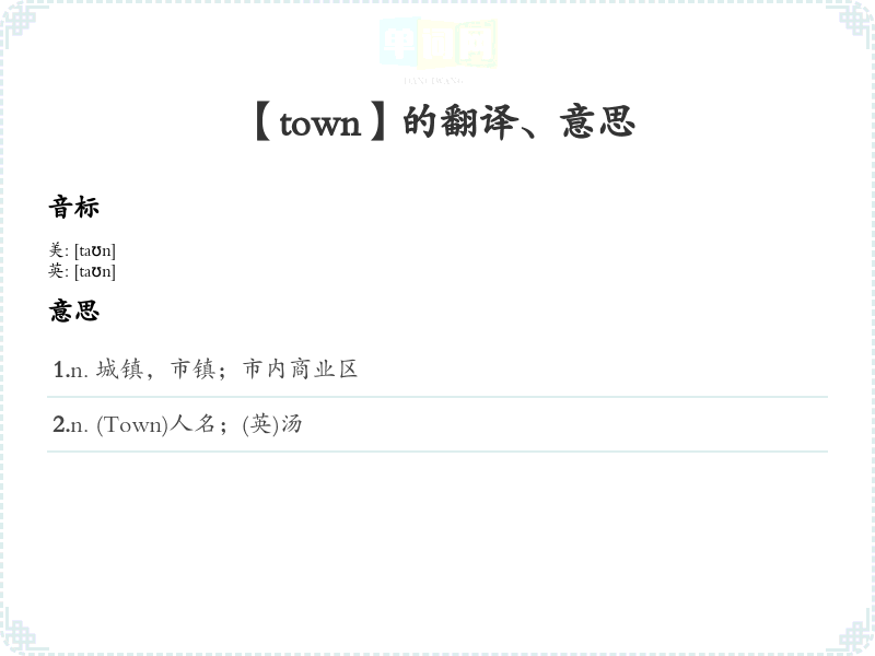 谐音联想记忆:可以将“town”联想为“探”+“围”,即探访围住的地方,帮助加深记忆。