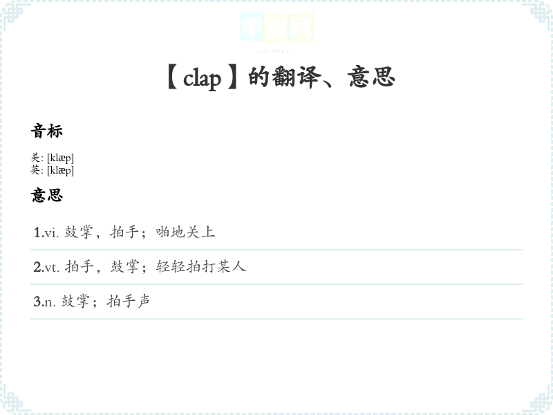Clap 的字面含义是用手掌相互撞击,通常发出声音以示赞赏或吸引注意。 - 词性: