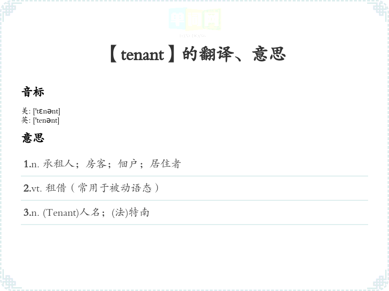 - 谐音联想记忆:将 "tenant" 与“天那”联系在一起,想象一个人租住在“天那”里的房子,帮助记住这个词的含义。