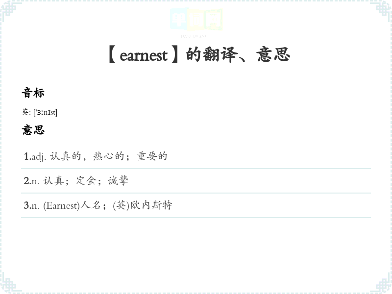 2.n. 认真;定金;诚挚 3.n. (Earnest)人名;(英)欧内斯特