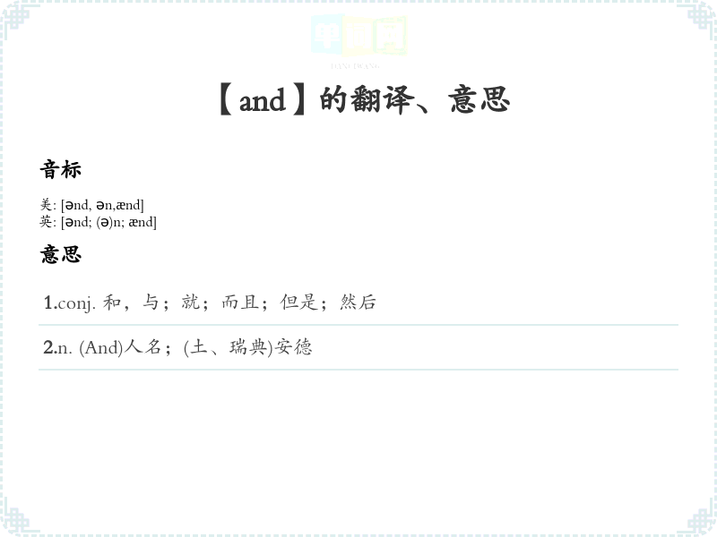 1.conj. 和,与;就;而且;但是;然后 2.n. (And)人名;(土、瑞典)安德