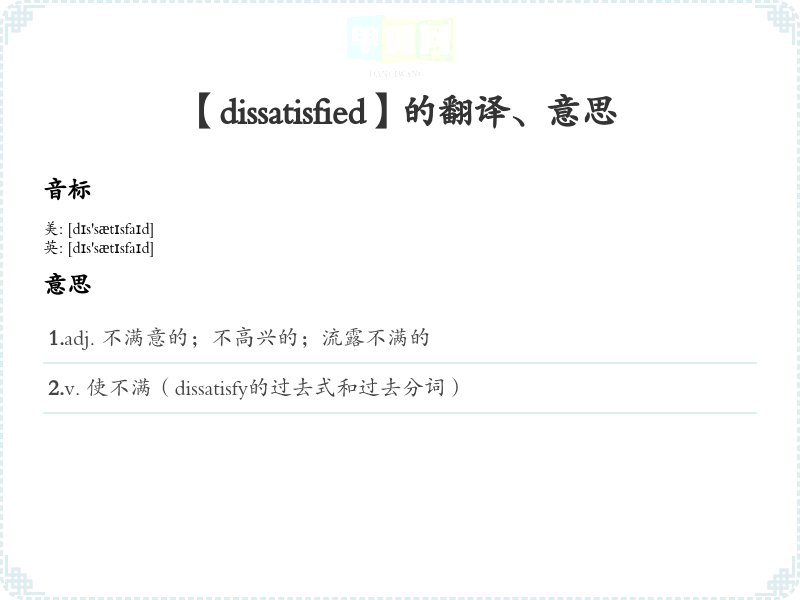 - 字面意思:dissatisfied 是由前缀 "dis-" 和形容词 "satisfied" 组合而成。字面意思指的是对某事物不满意或感到不满足。