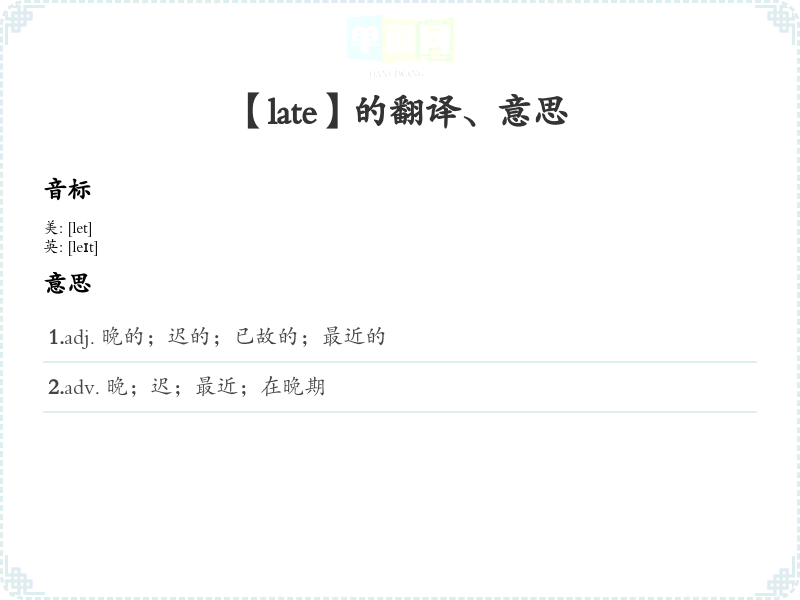 - "Late" 的音标为 /leɪt/,可以通过读音练*,反复朗读,使其在脑海中加深印象。