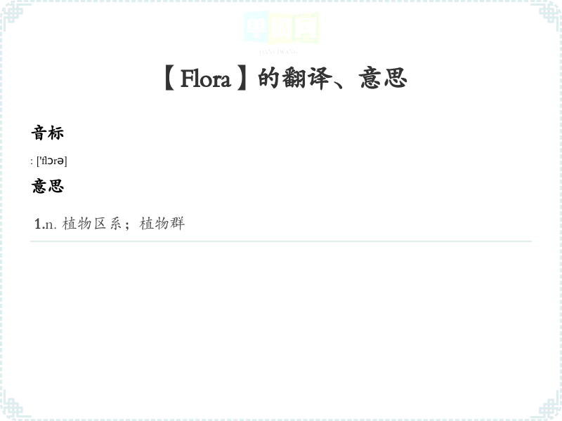 - 音标记忆法:Flora 的发音为 /ˈflɔːrə/,可以通过分解音节来记忆,例如“弗-洛-拉”。