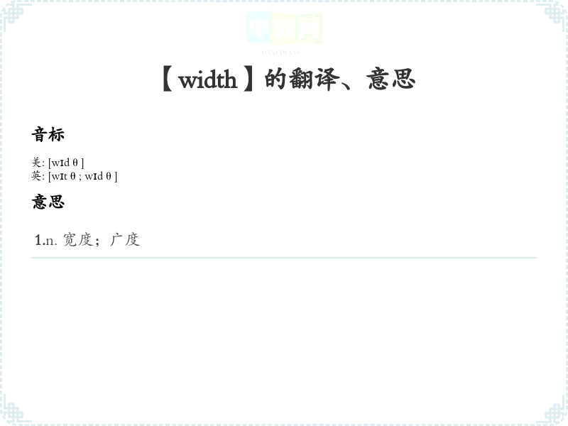 - 音标记忆法:Width 的发音为 /wɪdθ/,可以通过分解音素来帮助记忆,比如“w”代表宽广的开始,“idth”可以联想为“宽度中的一部分”。