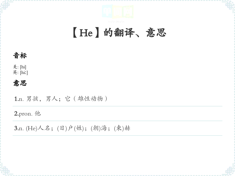 通过音标记忆“he”的发音 /hiː/,可以记住这个词的发音和用法。 -