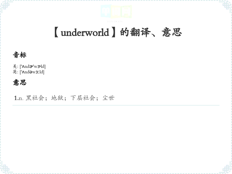- 通过分解音节来帮助记忆:/ˈʌndərˌwɜrld/,可以将其拆分为 "under" 和 "world",理解为“在下面的世界”。