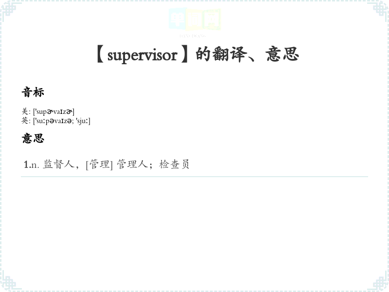 - Supervisor的音标为 /ˈsuːpərvaɪzər/。可以将其分为几个部分进行记忆: