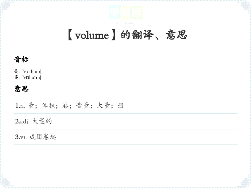 - 词源分析:Volume源自拉丁语“volumen”,意为“卷”或“卷轴”,其词根“volv-”表示“卷起”或“旋转”。