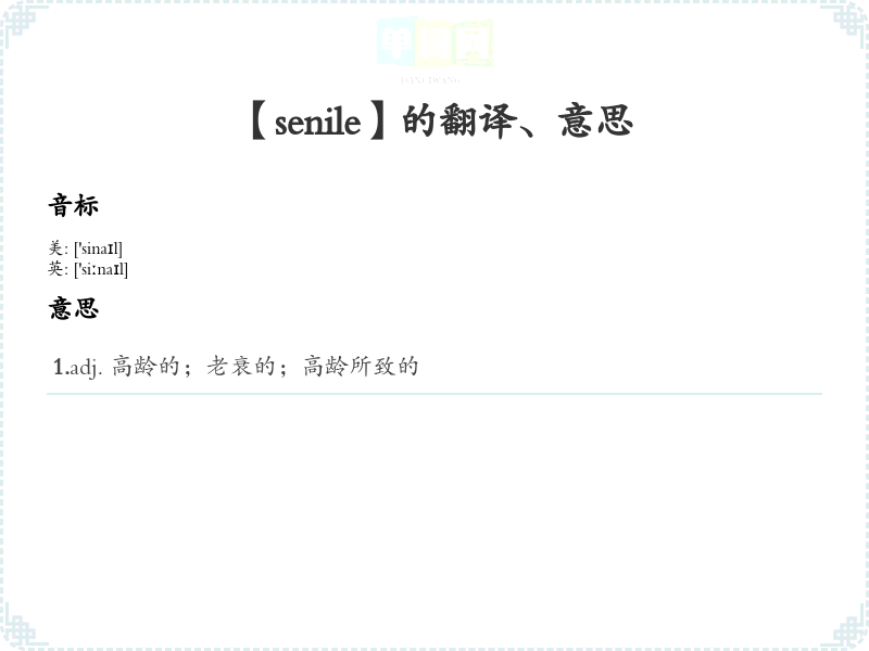 - 将“senile”分为“sen”与“-ile”。“sen”来自拉丁语,意味着“老年人”,而“-ile”表示“与……相关”。通过理解词根,可以更容易记住这个词的含义。