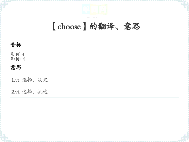 通过上述分析,我们可以全面理解“choose”这个单词的含义、用法和学方法。希望这对您的学有所帮助!