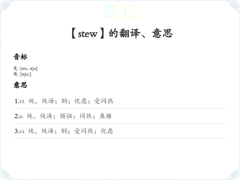 3.vi. 炖,炖汤;焖;受闷热;忧虑 4.n. (Stew)人名;(英)斯图