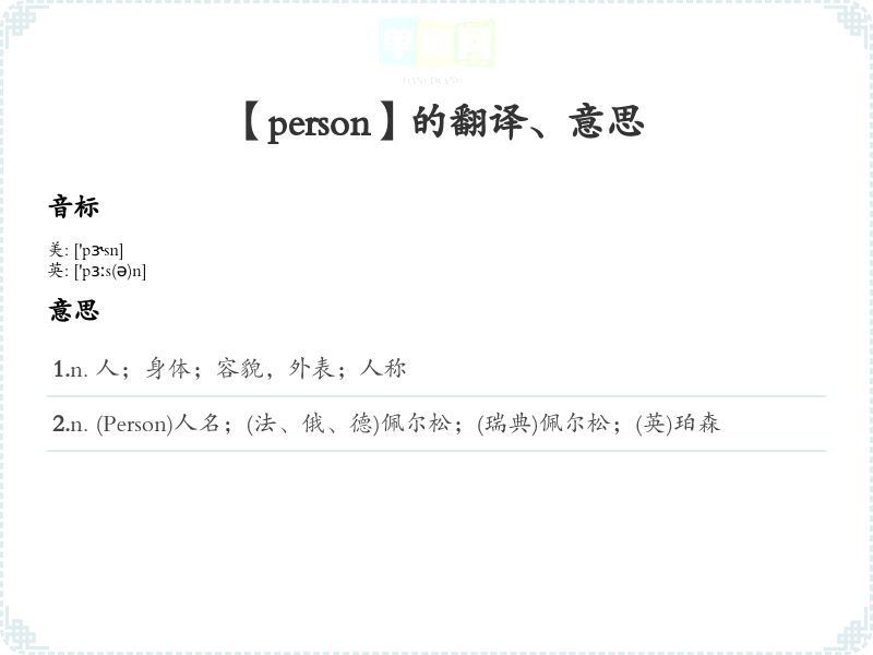 1.n. 人;身体;容貌,外表;人称 2.n. (Person)人名;(法、俄、德)佩尔松;(瑞典)佩尔松;(英)珀森