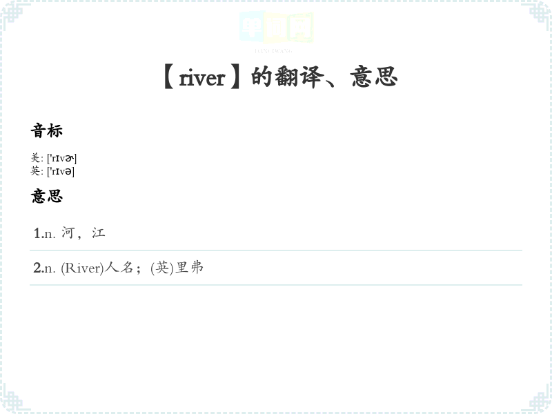 - 音标记忆法:记住“river”的发音是/ˈrɪvər/,可以分为两部分:“riv”(像“rivet”)和“er”(像“her”)。可以通过重复练*发音来加深记忆。
