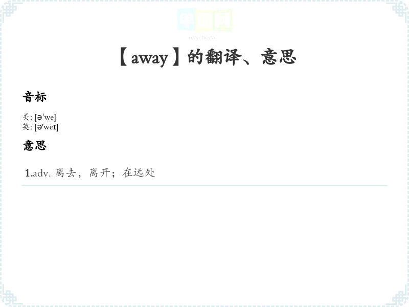 学*“away”的音标为/əˈweɪ/,可以通过重复发音、分解音节(a-way)来帮助记忆。 -