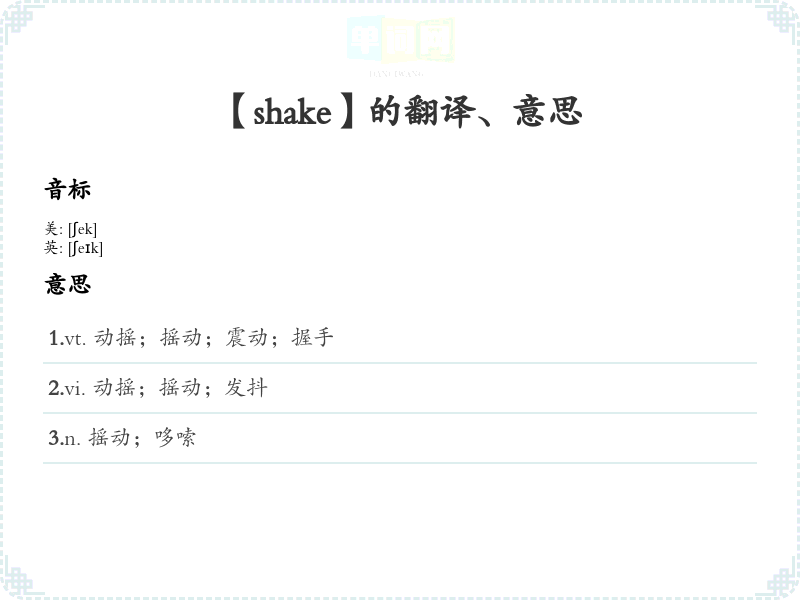 - 词性:动词(verb),可转化为名词(noun),如 "shake"(动词)和 "shake"(名词,意为“摇动”或“震动”)。