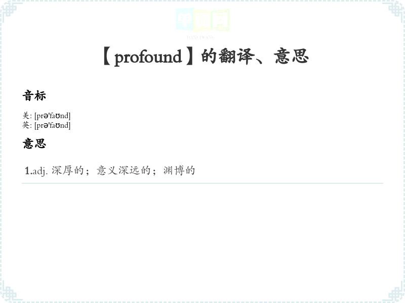 - 音标记忆法:通过发音 [prəˈfaʊnd] 来帮助记忆词汇,可以分解为“pro-”和“found”,联想成“向前找到深度”。