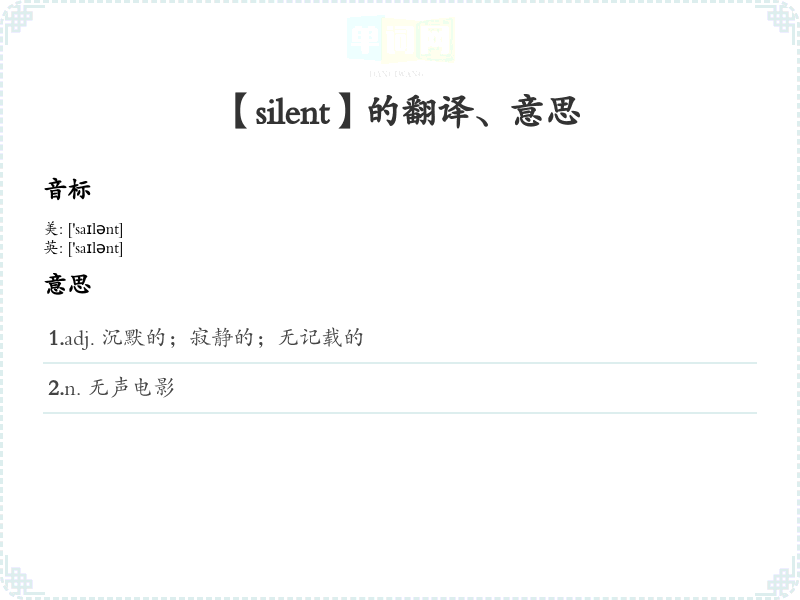 - 词根记忆法:理解 "silent" 的词根 "sil-" 代表“安静”,可以帮助记住其含义。