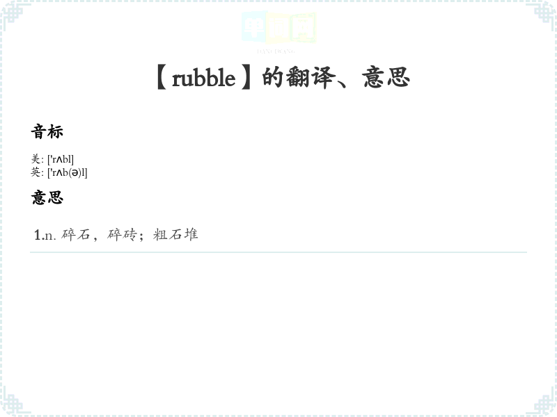 - 词根记忆法:将 "rubble" 关联到“破碎”的概念,帮助理解其含义和用法。