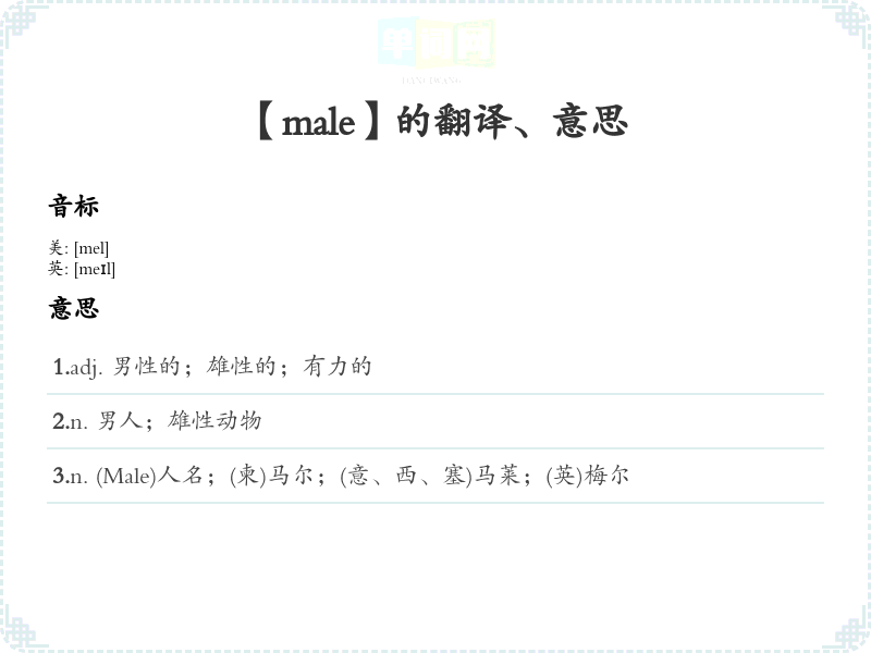 2.n. 男人;雄性动物 3.n. (Male)人名;(柬)马尔;(意、西、塞)马莱;(英)梅尔