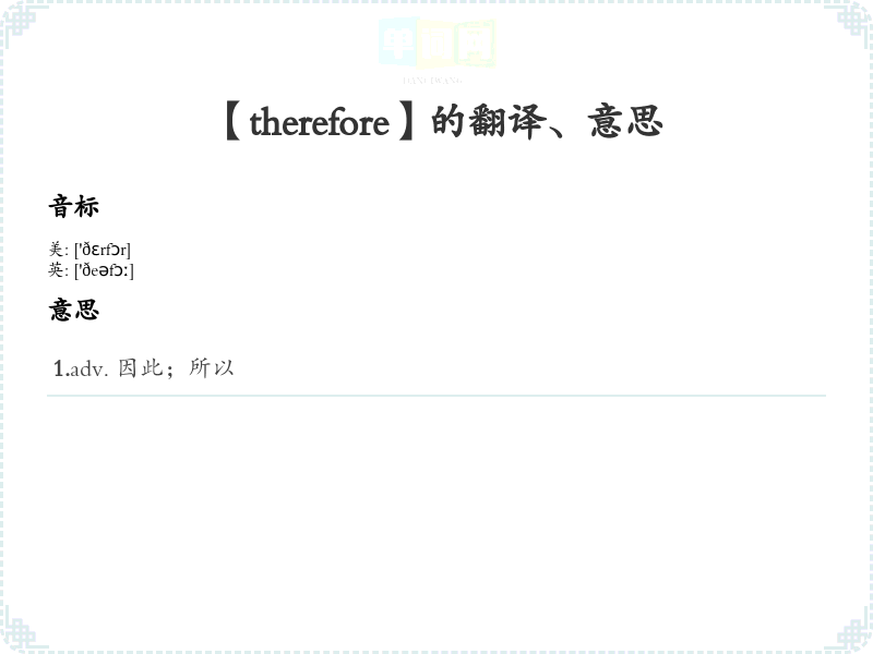 谐音联想记忆:联想“therefore”与“there for”,即“在那里为了”,帮助理解其因果关系。